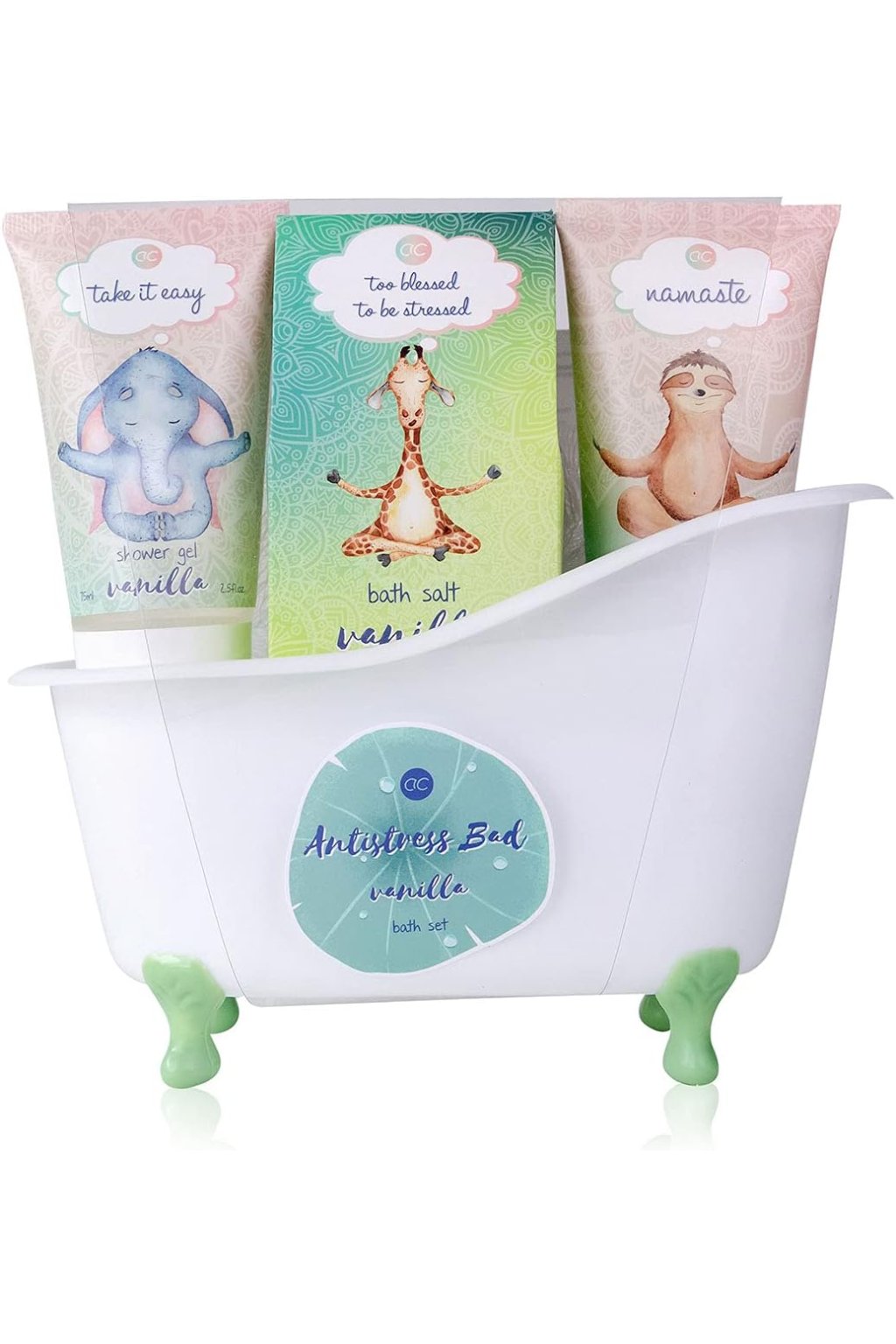 Zestaw zawiera 100 g soli do kąpieli, 75 ml balsamu do ciała, 75 ml kremu pod prysznic, gąbkę do kąpieli i piękną wannę.