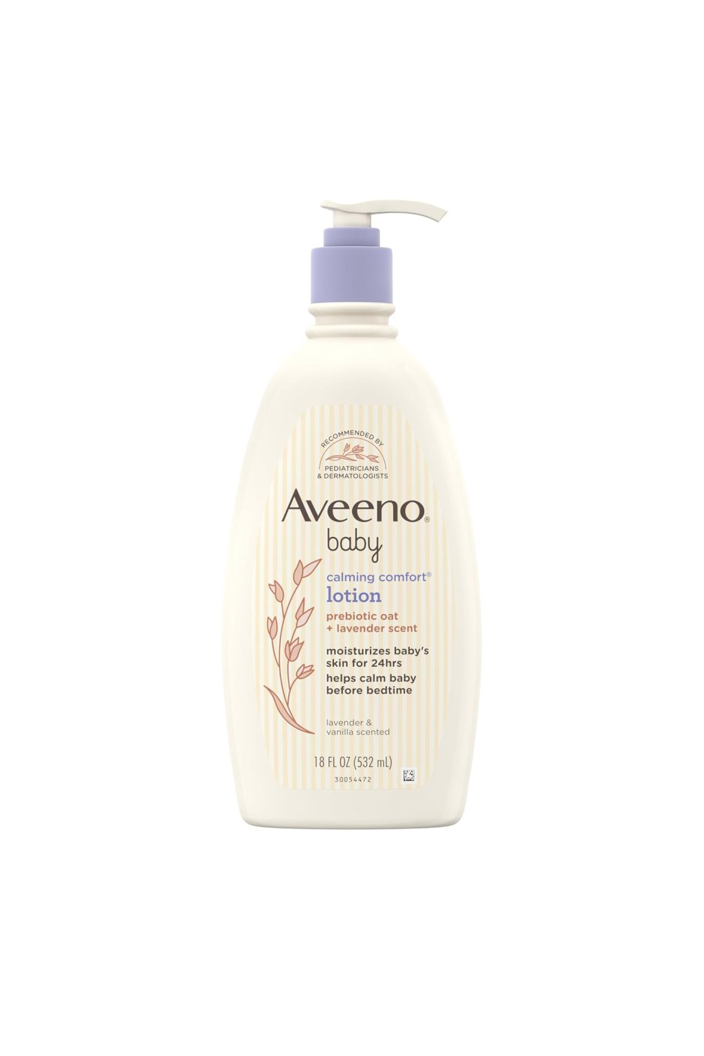 Nawilżający balsam do ciała Aveeno Baby Calming Comfort o relaksującym zapachu lawendy i wanilii pomaga ukoić i uspokoić dziecko przed snem, jednocześnie nawilżając delikatną skórę przez 24 godziny.