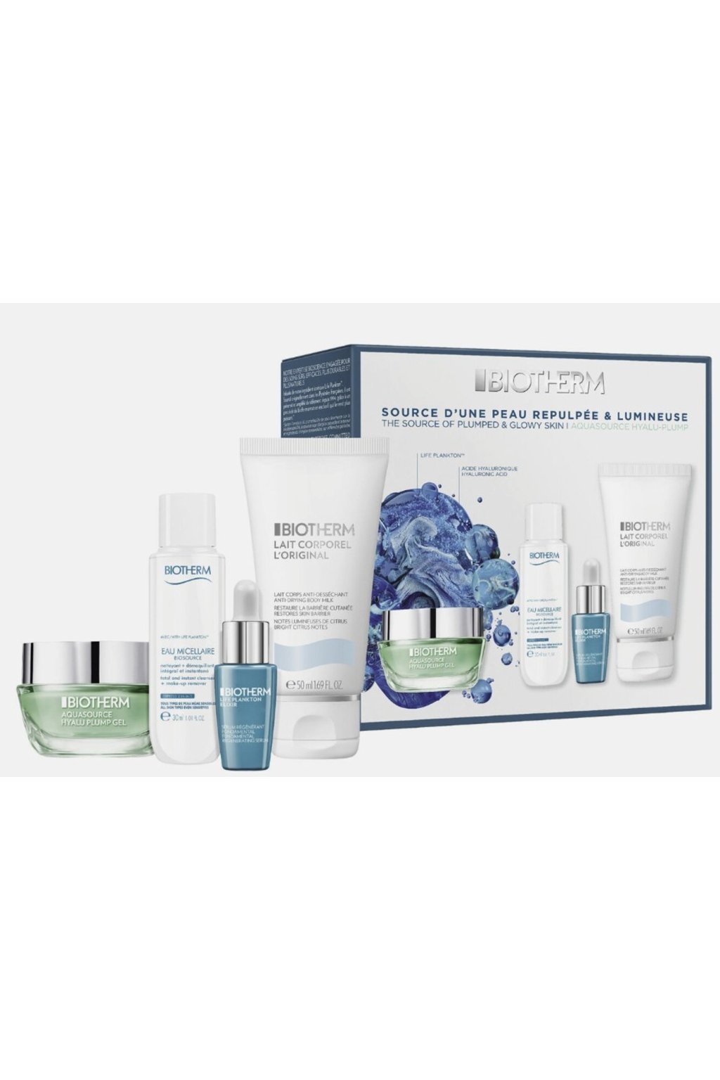 Zestaw zawiera: Biotherm Moisture Lait Corporel Nawilżający balsam do ciała przeciw wysuszaniu 50 ml, Biotherm Life Plankton Elixir Ochronne serum regenerujące 7 ml, Biotherm Biosource Eau Micellaire Micelarna woda oczyszczająca do każdego rodzaju cery, w tym wrażliwej 30 ml, Biotherm Aquasource Hyalu Plump Gel Nawilżający żel do twarzy 15 ml.