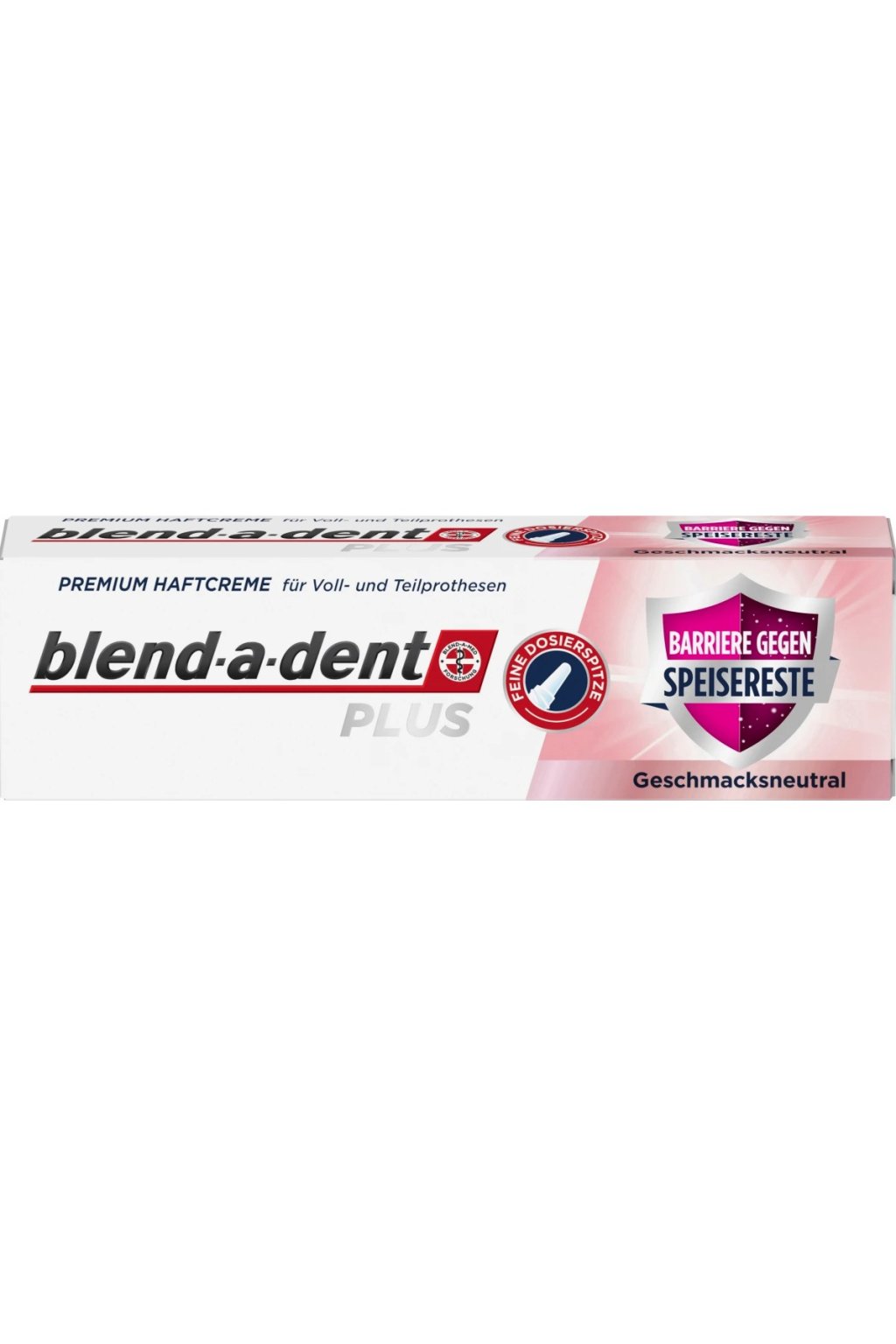 Blend-a-dent Plus z barierą dla resztek jedzenia, wysokiej jakości krem adhezyjny, do protez całkowitych i częściowych, bez smaku, wyprodukowany w Niemczech.