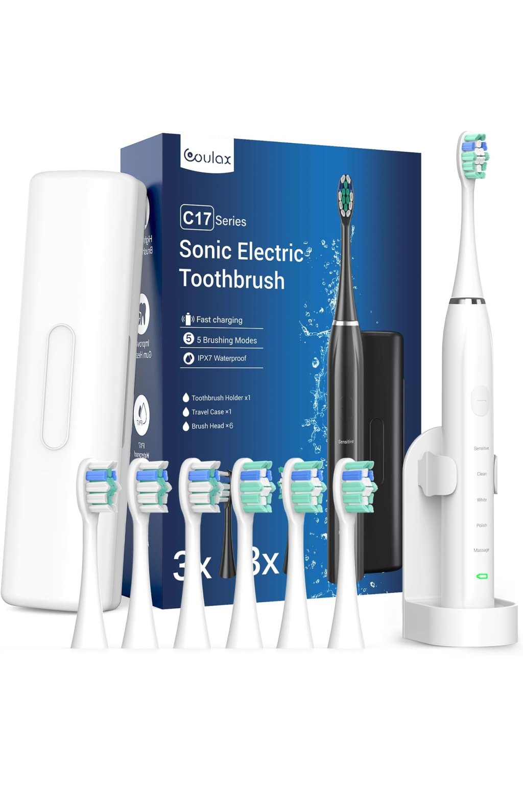COULAX Soniczna elektryczna szczoteczka do zębów z 6 główkami i etui podróżnym