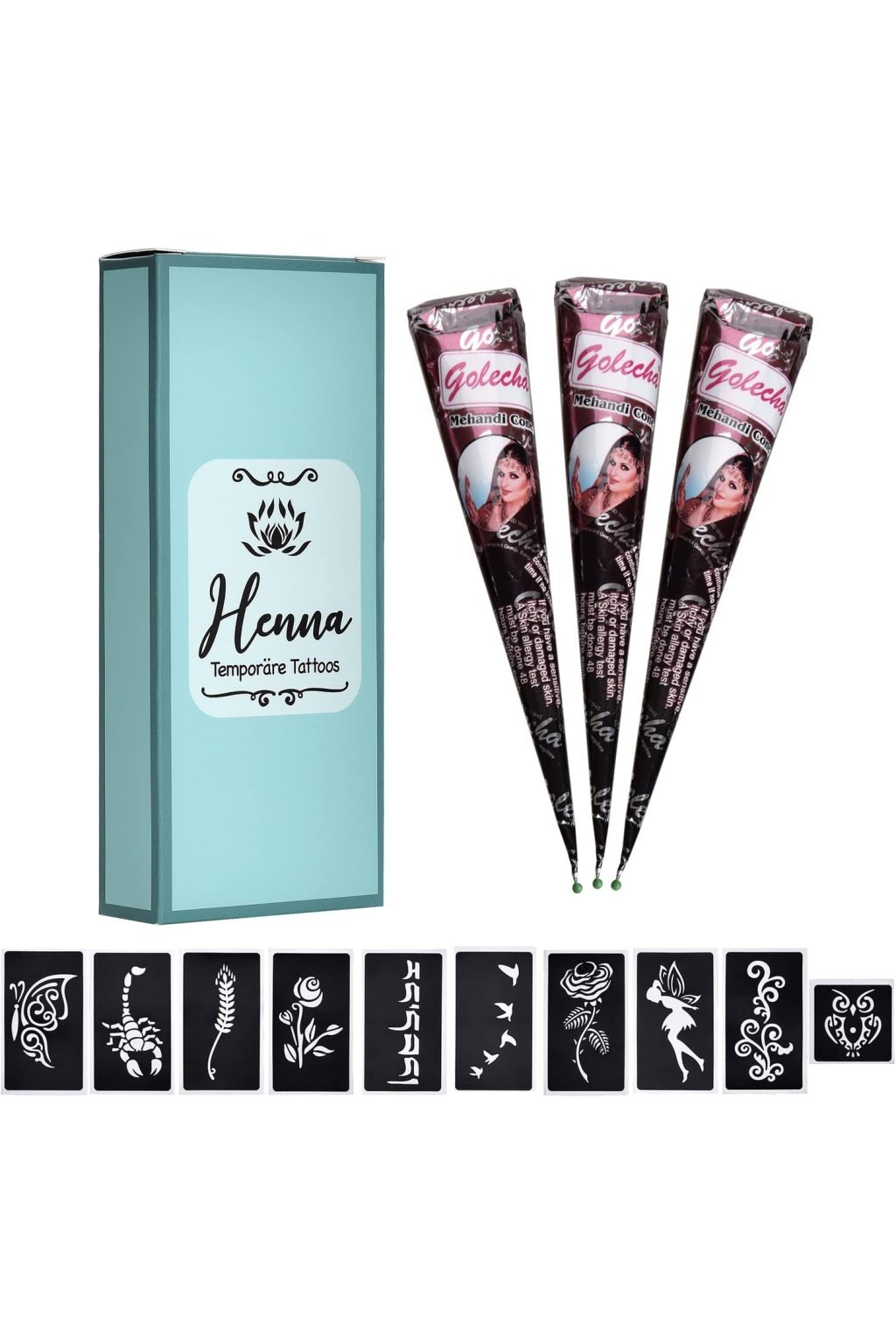 eLander 3 x tymczasowe tatuaże Henna naturalna 30 g to zestaw trzech naturalnych stożków z henną, które służą do tworzenia tymczasowych tatuaży na skórze. Henna znana jest ze swoich naturalnych właściwości, a produkt ten nie zawiera szkodliwych substancji chemicznych ani PPD, dzięki czemu jest odpowiedni nawet dla skóry wrażliwej. Tatuaż utrzymuje się przez kilka dni i jest łatwy w aplikacji, a ponadto opakowanie zawiera szablony ułatwiające tworzenie wzorów. Produkt jest idealny do tymczasowego ozdabiania ciała bez trwałych skutków.