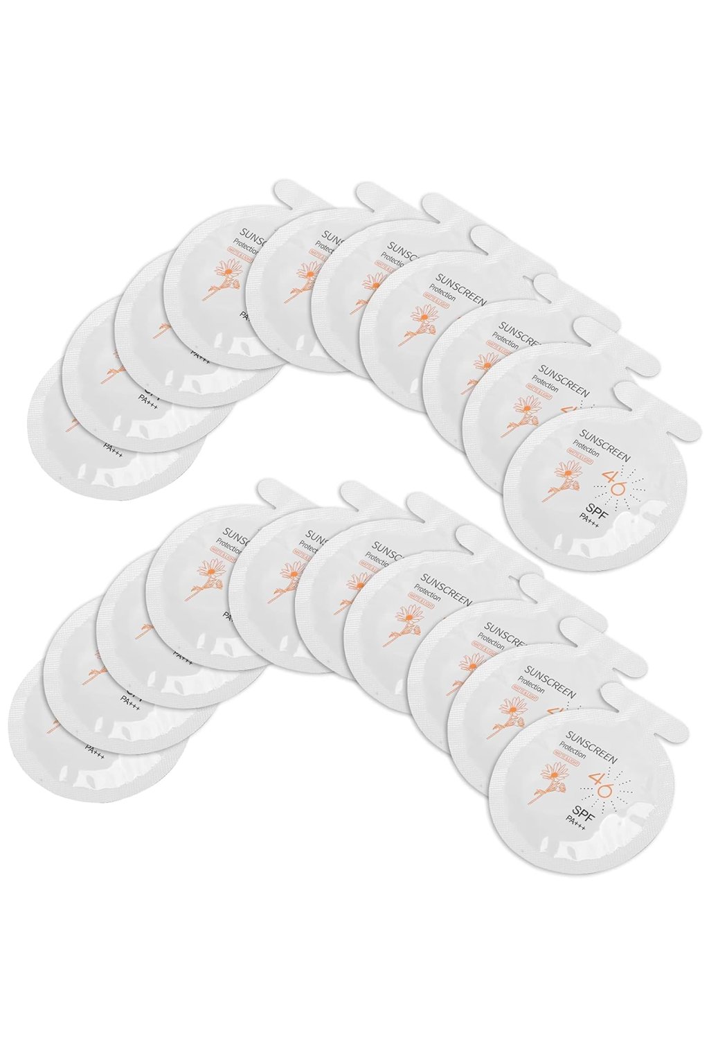 20 saszetek z filtrem przeciwsłonecznym, pakowanych pojedynczo, bezpiecznych i higienicznych, idealnych do stosowania w podróży.