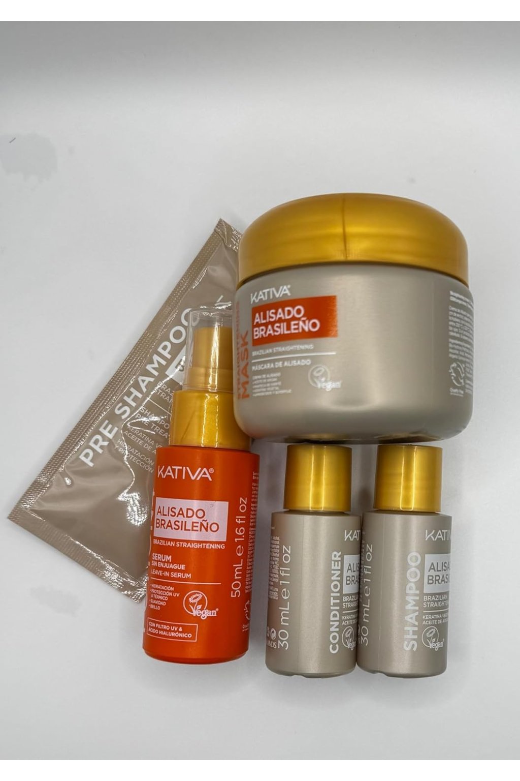 Kativa Premium brazylijski zestaw do prostowania włosów, 15 ml saszetka na szampon przed zabiegiem, 150 ml pojemnik na maskę prostującą, 30 ml butelka na szampon, 30 ml butelka na odżywkę, 50 ml butelka na serum.