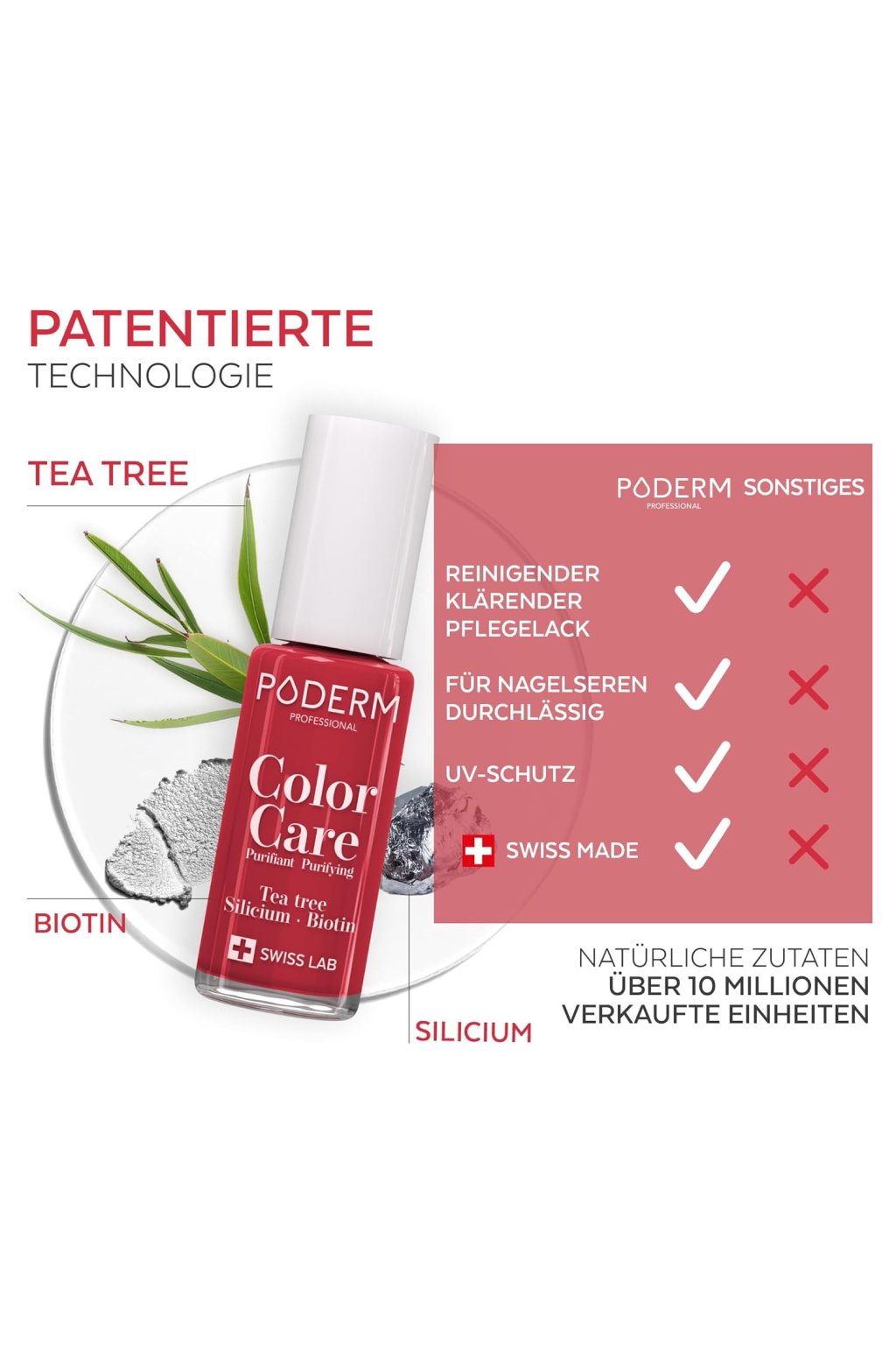 PODERM Color Strong dla mocnych paznokci to rewolucyjny produkt do pielęgnacji, opracowany w celu wzmocnienia i ochrony osłabionych lub zniszczonych paznokci. Dzięki zawartości keratyny, biotyny i krzemu wspomaga regenerację i zwiększa odporność paznokci na łamliwość i rozdwajanie. Ten wielofunkcyjny lakier można stosować samodzielnie jako naturalny środek wzmacniający lub jako bazę pod kolorowy lakier dla maksymalnej ochrony. Jego skład nadaje paznokciom witalność, połysk i elastyczność, przywracając im naturalne piękno. Lakier łatwo się nakłada i szybko schnie, dzięki czemu idealnie nadaje się do codziennego stosowania.
