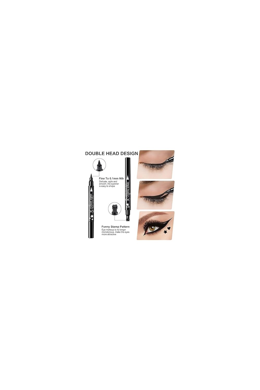 Jedna główka to cienka i wodoodporna kredka do oczu do rysowania precyzyjnych kresek, a druga to stempel do ozdabiania oczu.