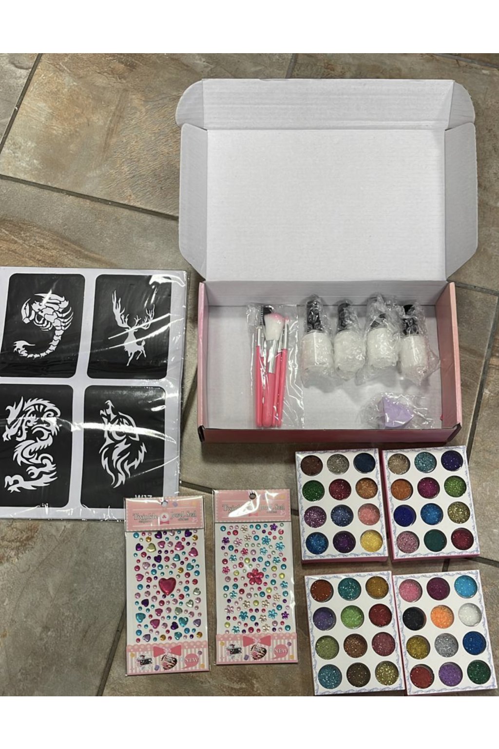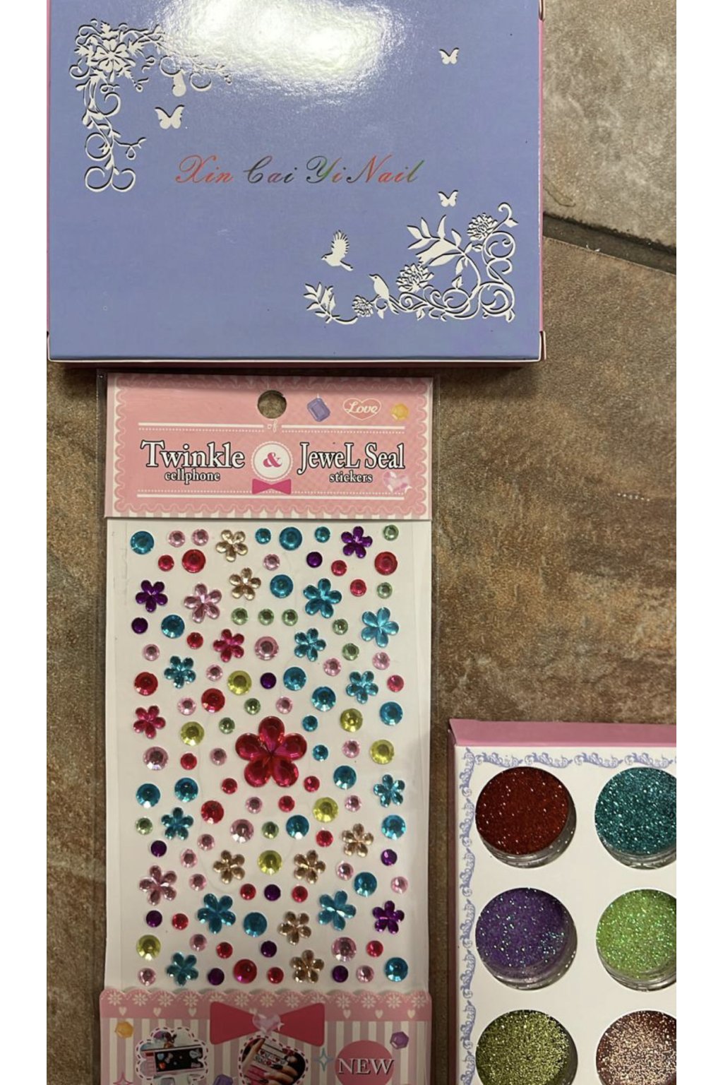 Zestaw zawiera brokatowe lakiery, naklejki z klejnotami, pędzle.
